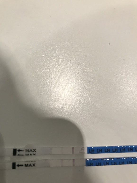 Овуляция( тесты на овуляцию)Всем привет. Последние месячные были 13.10, на узи 29.10 была подтверждена овуляция, после овуляции пила дюфастон, сегодня последний день. После овуляции желтое тело было 17 мм и эндометрий 9 мм. Вчера 5.10 на узи желтое тело угасло до 10 мм, это было видно и по бт, ну или узист не нашел его, но в левом яичнике фолликул есть 13 мм, пришла домой и вскрыла тест на овуляцию, никогда его не делала, вот картина какая. Верхний вчерашний, нижний сегодня. Он поярчал? Не спрашивайте как предыдущих детей зачала, вот никогда не делала это с помощью тестов на овуляцию) спасибо всем, кто откликнется.