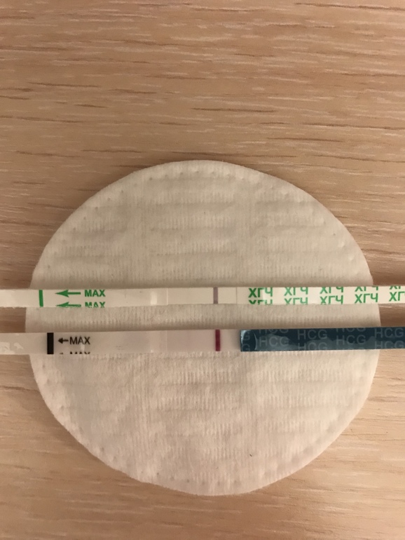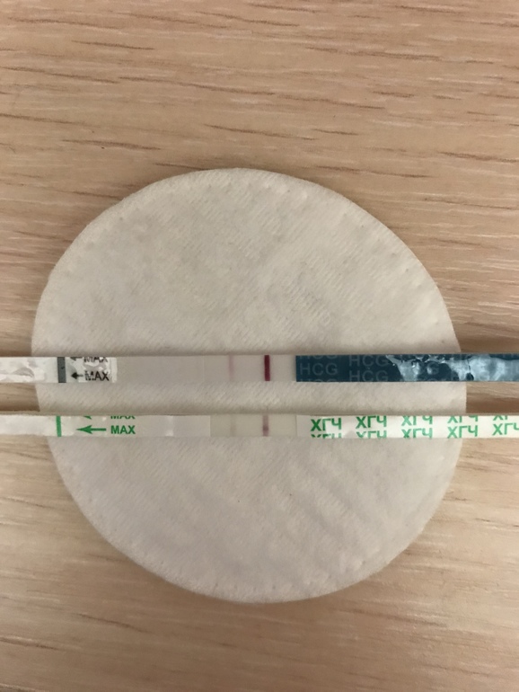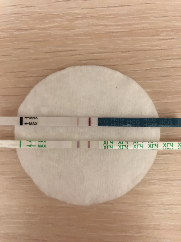 ✅10 ДПО Утром тест оказался бледнее, но полоска была! Я испугалась, что опять бхб будет, записалась на следующий день к гематологу. Вечером полоска поярчала.