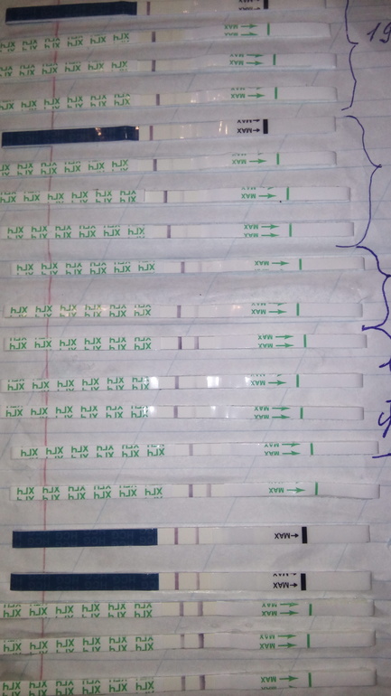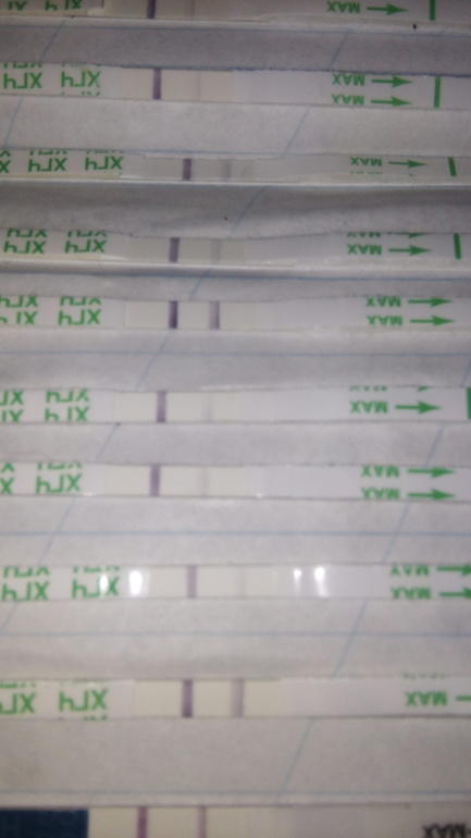 вот вся картина тестов. Я сделал тест в 4 утра, и легла спать, проводила сына, сделала еще один, смотрю, на двух тестах светлые полоски, ну думаю все,написала сюда, девочки мне мозги вправили, мужу в телефон поревела, и поехала на кровь, всю дорогу туда и обратно, я мысленно молилась, плакала в автобусе, приехала домой купила еще 5 тестов, замачиваю в обед, а там хорошая, яркая полоская, вот только тогда мне стало легче. Утром пришел хгч, и я успокоилась.