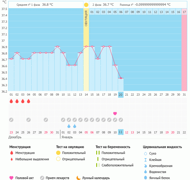 Если женщина здорова, цикл у нее регулярный, то сразу после окончания месячных (фаза созревания фолликула с яйцеклеткой) температура незначительно повышается (до 36.5°-36.8°). Затем в середине цикла (перед овуляцией) она уменьшается до 36°-36.2°, достигая минимума в момент разрыва фолликула и выхода из него зрелой яйцеклетки.