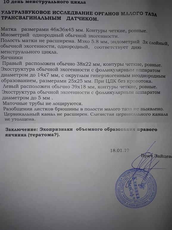 Вам надо идти к врачу. Вам же в заключении написали объемная тератома!!!! Надо либо исключить,либо подтвердить и лечить!