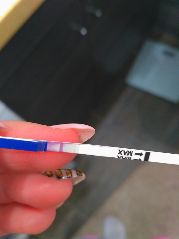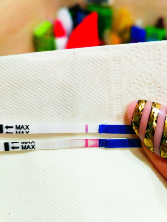 Ну нижний размытый-краска с контрольной полоски попала на вторую, поэтому такой яркий. Я бы не стала такому доверять. Лучше переделайте тест другого производителя. Чтобы наверняка )))