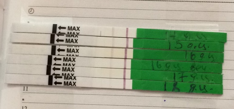 На фото видно, что самая яркая полоска на 16 день, потом идёт резкий спад. Я бы может и не обратила внимания, просто посчитав, что возможно овуляции не было, если бы не одно но. В тот же самый 16 день цикла через пару часов после проведения теста начались ощущения очень похожие на овуляцию. Легкие тянущие боли, покалывания то в левом , то в правом яичники, в матке тоже, и потом с левой стороны боль чуть усилилась и как-будто что-то набухло( мне показалось , что я почувствовала трубу, но не факт). Вообще весь этот процес длился часа полтора два, потом тишина. Я решила переделать тест ближе к вечеру(это был единственный тест который был сделал не в то время что все остальные) и там видно, что полоска уже побледнела. И после два дня видно, что полоска исчезает . Что это все таки было? Овуляция или нет ?