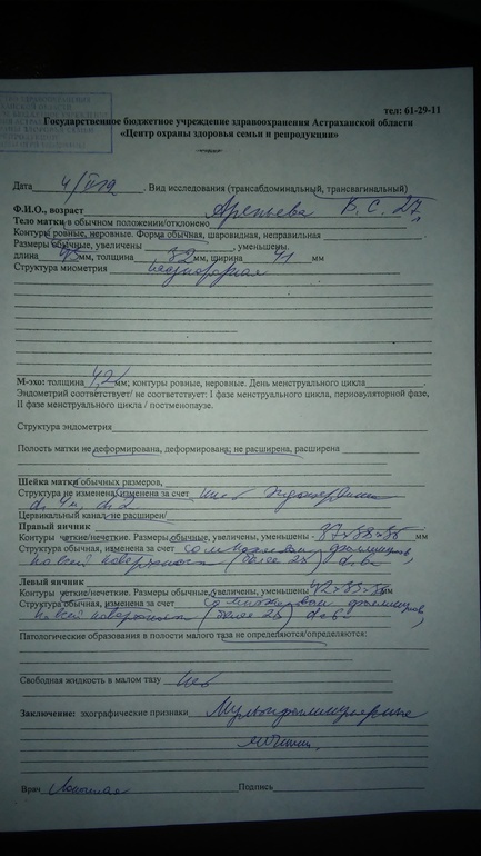 Посмотрите пожалуйста что не так?это вообще лечится?я не беремению 5лет.Менструация пропадала и приходилось дюфастоном вызывать....