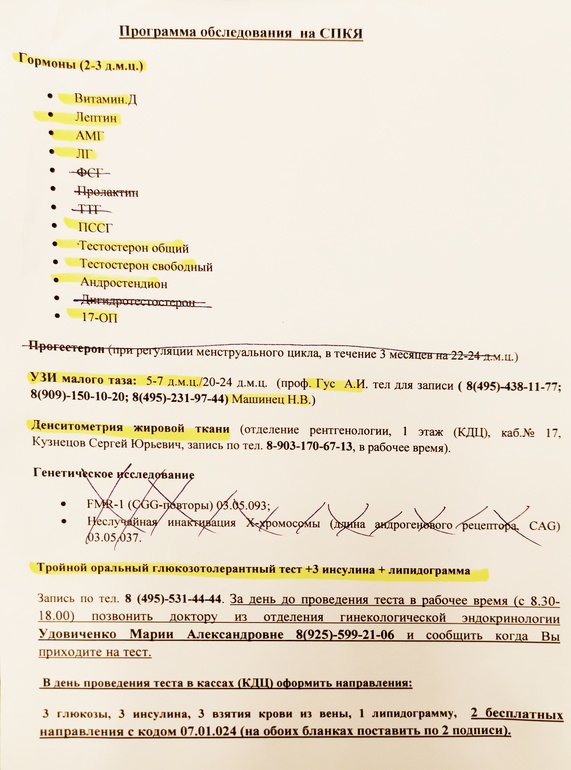 Гинекологические заболеванияТакой диагноз мне ставили с юности. Недавно, гинеколог из жк подтвердила и сказала, что для нормализации цикла мне сидеть на гормонах всю жизнь. Скажу честно, моя гинеколог мне нравится, она внушает доверие. Но. Совершенно случайно, листая инстаграм (боги, какой кошмар, эти соцсети везде 🤦♀️), я наткнулась на гинеколога-эндокринолога из центра, где я рожала, центра акушерства, гинекологии и перинатологии им. Кулакова. Поэтому я стала читать, что он пишет. А писал он как раз про спкя, много и подробно. И тут я поняла, что моя гинеколог не права. Сегодня я сходила на приём к этому врачу. И вот такой план обследований он мне назначил. Если по итогам спкя все же подтвердится, то не только не нужна гормоналтная терапия, так ещё и можно будет полностью вылечить его! Если интересно, то могу потом рассказать, как будет проходить лечение