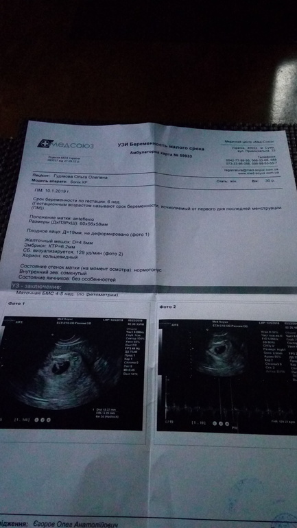 Это показало на УЗИ в 4-5 нед (от зачатия) и 6 нед от 1 дня последних М..