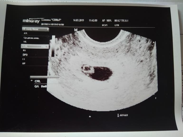 Итак, ровно 6 неделек. Что мы увидели? Плодное яйцо 30мм, желточный мешок 4мм и эмбриончик с КТР 2,9мм. Послушали сердечко 😍😍😍 ЖТ в правом яичнике 19мм.