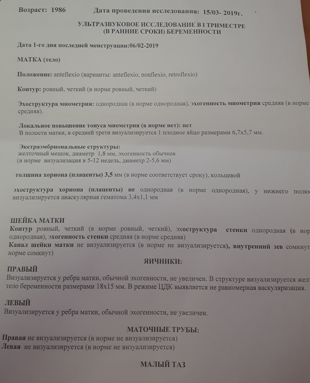 Подскажите, а размеры ПЯ? И то что гематома, и еще эхоструктура хориона не однородная.