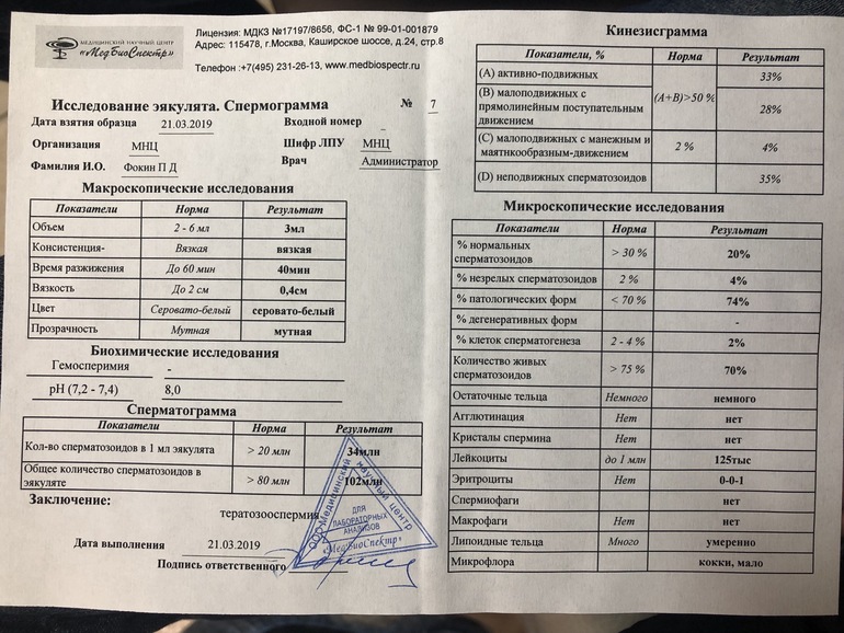 У меня муж несколько лет назад сдавал спермограмму, я уже не помню точно какие там были показания (помню, что была вязкая сперма и почти все были полудохлые), тогда мой Г сказал, что с такими результатами забеременеть нереально. Уролог ему назначил делать массаж простаты и выписал какие-то БАДы. Я сама вычитала в интернете, как улучшить качество спермы. Во-первых: много цитруса надо есть. Витамин С улучшает сперму. Потом принимал витамин Е, витамин А, фоливую кислоту и Спеман (производство Индия). Не прошло и месяца после приема всего этого, как у меня тест стал полосатый.