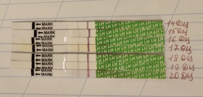 Овуляция( тесты на овуляцию)Всем добрый день! Снова я. 2 дня назад тут выкладывала тесты на овуляцию, кто-то писал, что тесты скоро-скоро поярчают. Так вот нет (( я так понимаю, в этом цикле ждать ее уже не стоит? ЯБ кстати был на 17дц.