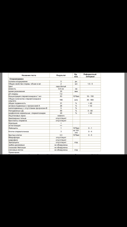 Смотрите-ка, морфологически нормальные формы у Вас 25% при норме от 30%, это вероятно нормы ВОЗ 2010, а лучше морфология по Крюгеру (загуглите и поймете). У нас по ВОЗ было 83%, а про Крюгеру всего 19%