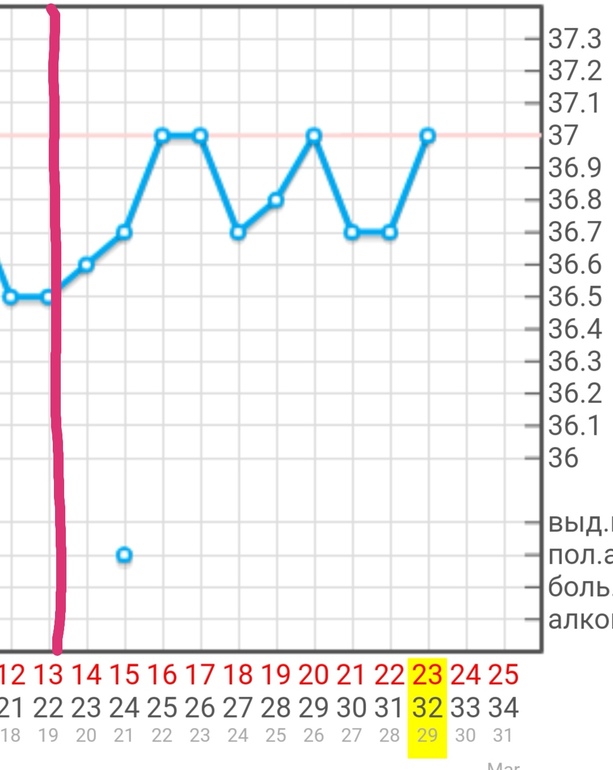 Базальная температура, ТТ, графики БТДевочки, кто разбирается в графиках, подскажите. Может ли при таком графике второй фазы, быть беременность? Розовая линия-овуляция