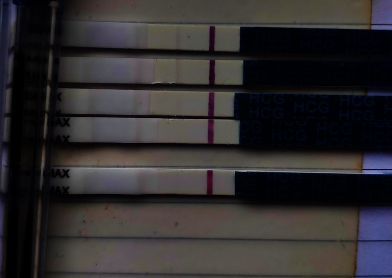 Ждем дня Х (Признаки беременности / Тесты)Девочки привет, этот цикл в первы раз в жизни был на стимуляции плюс на 16 ДЦ овитрель 6500 ед, овуляцию подтвердили на 18 ДЦ уже жёлтое тело было, потом ещё два укола прегнил в поддержку 1500, на 19 ДЦ и 22 ДЦ, первый укол вышел за 3 дня судя по тестам, решила смотреть как второй выходить будет, начала делать эви голубые на следующий день после укола, сегодня получается 10 дпо, последний эви нижний самый это сегодня, сделала вроде что то глаз цепляет вживую по сравнению с вчера, решила замочить femitest ultra, дома валялся один, и там вылезла сразу розовая хорошо заметная полоска, теперь ломаю голову, или он так хорошо след укола зацепил через 5 суток, или тут уже есть и мои //, как думаете? Фото эвиков по дням начиная с 6 ДПО с затемнением и без, и отдельный тест (нижнее фото) это феми ультра