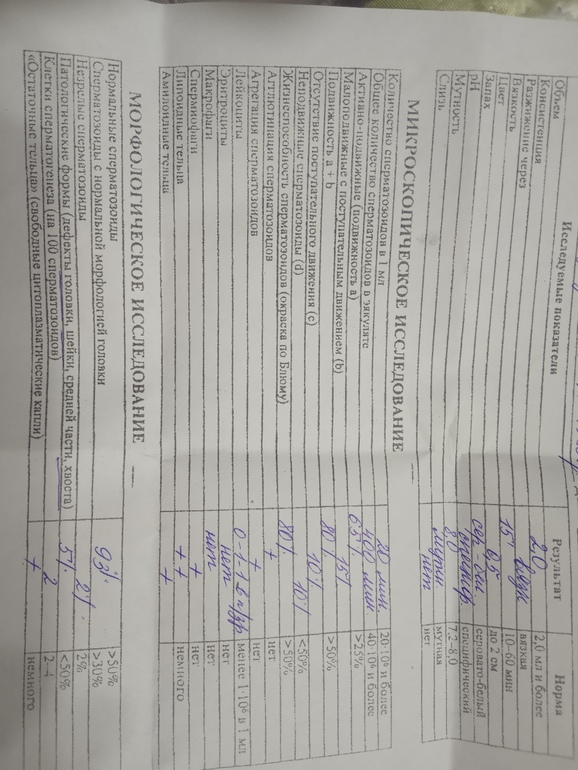 Если есть возможность, пересдайте в лаборатории, где считают морфологию по Крюгеру, подсчет ведут опытные эмбриологи. Количество спермиев - 20 млн в 1 мл - мало, но достаточно. Либо просто временное ухудшение, либо начало какого-то заболевания в организме, либо последствия какого-то заболевания. Поэтому необходимо посмотреть на вторую СГ, сданную, как указано выше, если есть возможность. Муж не жалуется на мочеиспускание, на ощущения в простате, не болел месяц-два назад?