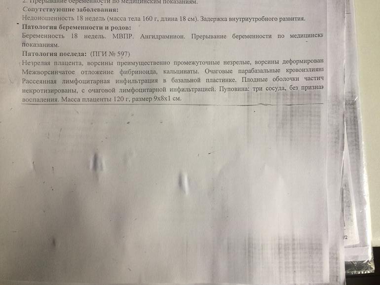 Замершая беременностьЕсли кратко, то вызвали роды, потом дочистили и через пять дней после курса антибиотиков отпустили. Сегодня забрала гистологию, но понять не могу по поводу патологий последа, ведь именно там ищу причину случившегося. Откликнитесь пожалуйста те, кто хоть что-то понимает, знает? врач в роддоме в спешке толком ничего не объяснила, в жк по месту жительств только через несколько дней на приём.