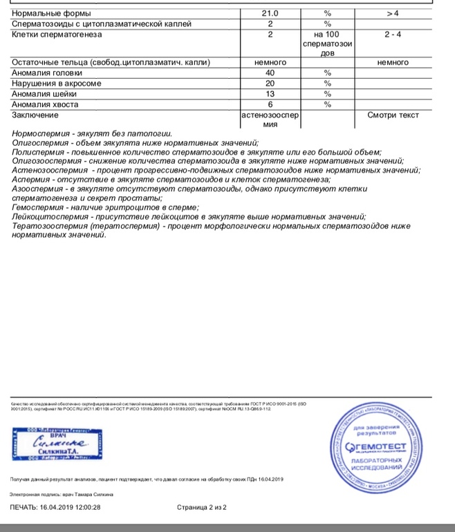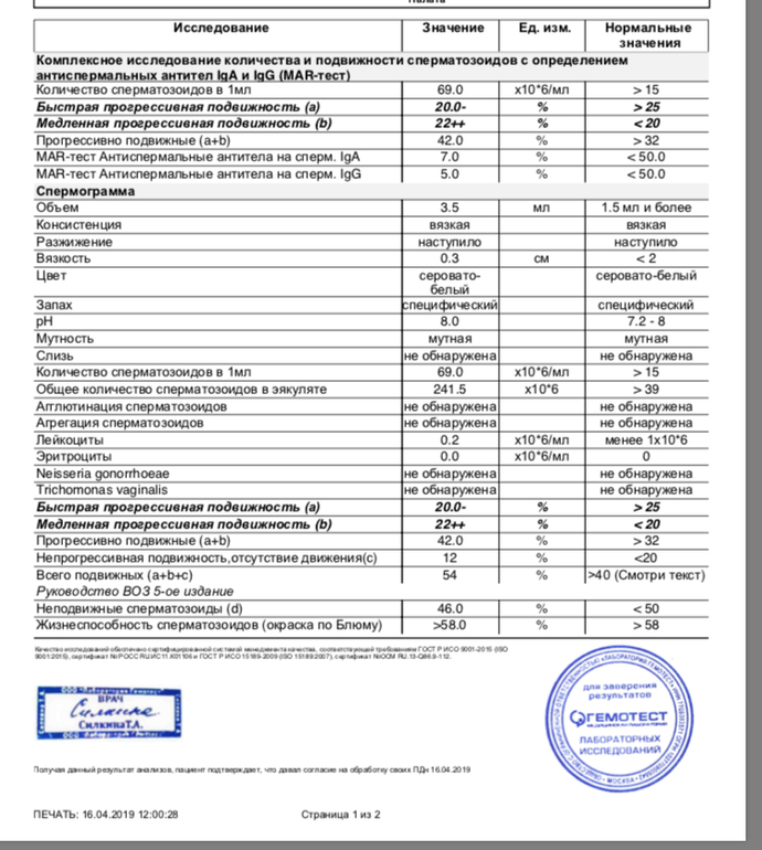 Нууу неплохая сг, только подвижность снижена, и ph на верхней границе. Жаль, что нету сколько живых... антитела, лейкоциты, трихомонады, агглютинация отсутствуют, это очень хорошо. У нас морфология была 19%, подвижность а+в 52%, но агглютинация ++. Нам сказали пить много воды, выписали витамины и сказали не переживать🤷♀️