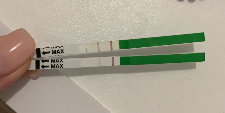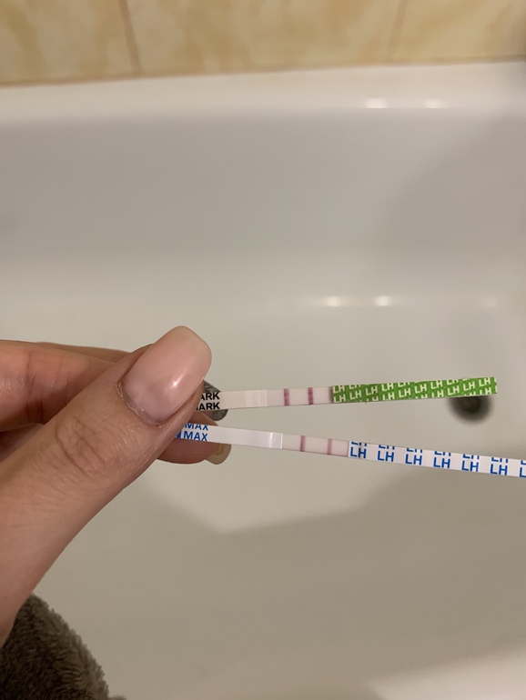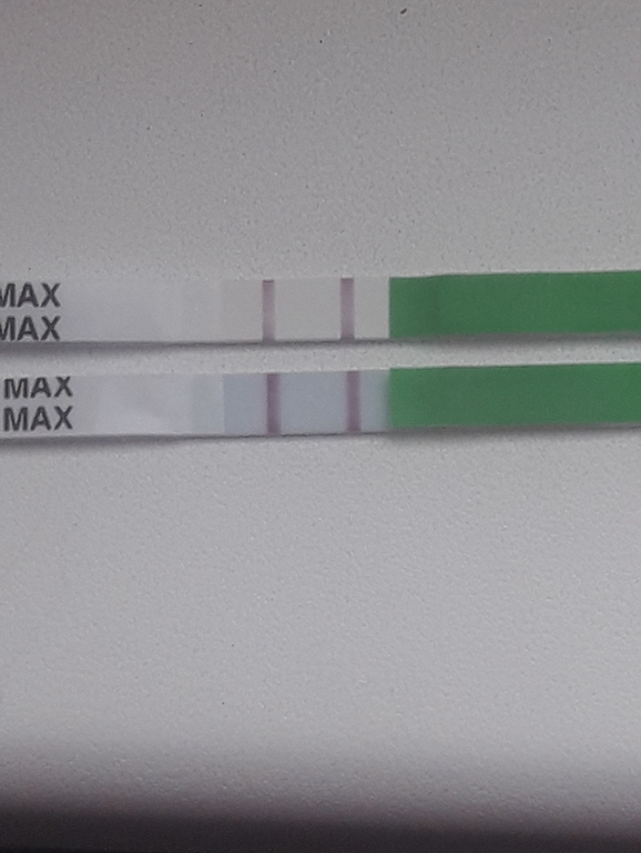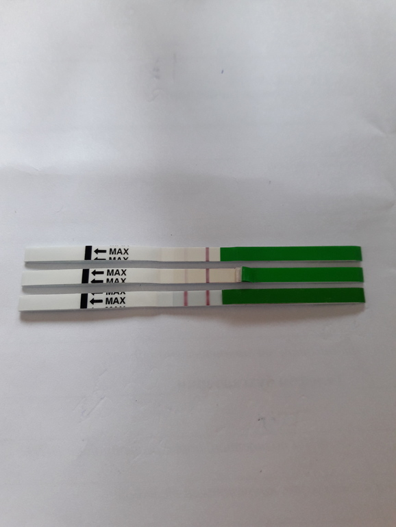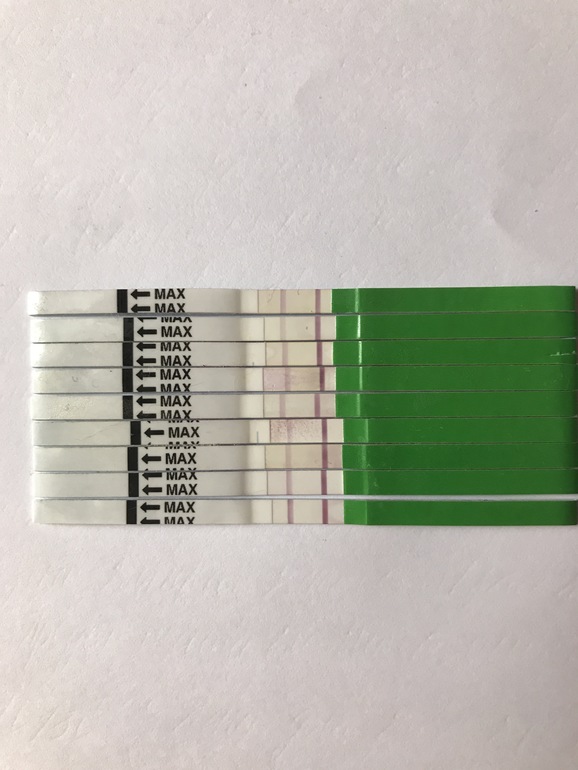 Вот тут хорошо видно. Самые нижние два теста-это текущий цикл. Подозреваю что сделала тест после овуляции, так как полоски по интенсивности похожи на те, которые на 19 дц были