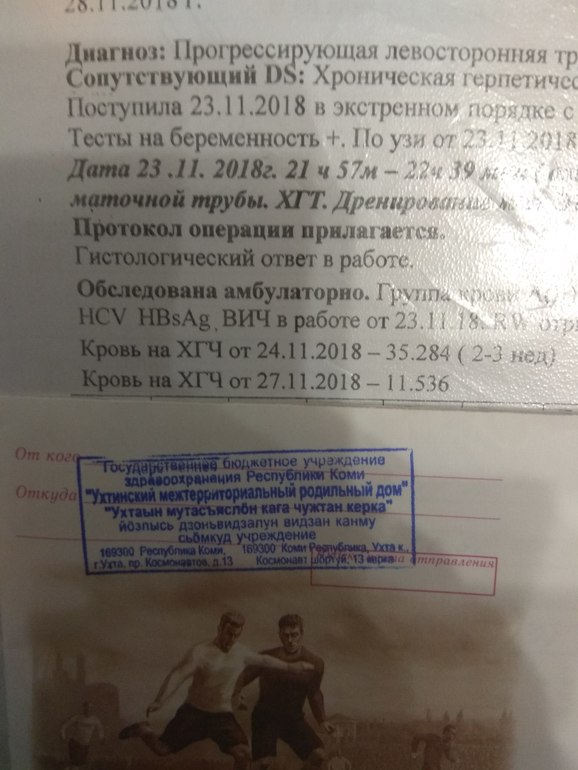 У нас нет ХГЧ,к сожалению, поэтому отправили домой как есть. Операция была в городе. При выписке был ХГЧ смотрите в фото