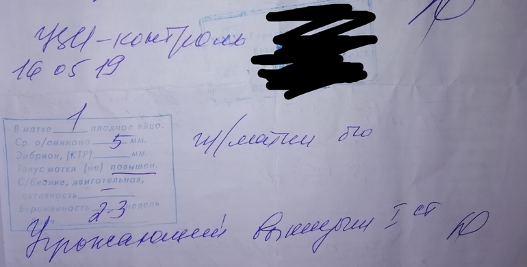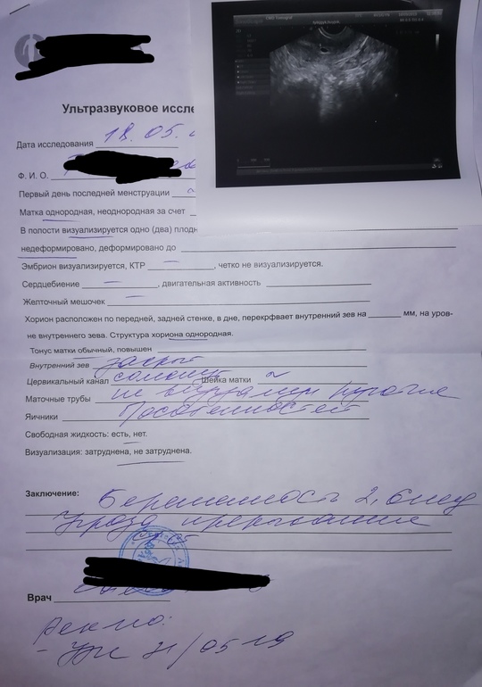 Последние М были 29.03.2019 (цикл не регулярный, от 27 до 33 дней колеблется), ПА был 20.04.2019 (как я поняла, у меня была поздняя О). Сделала первый тест на Б 30.04.2019, была еле-еле заметная, почти не видная, вторая полоска. 1.05.2019 повторила тест и вот они, долгожданные две полоски. Затем ещё несколько дней делала тесты и полоска становилась всё ярче. 7.05.2019 пошла на УЗИ, ничего не увидели, сказали только, что матка чуть увеличена. Посоветовали сдать ХГЧ, результат 555 (беременность 2-3 недели). Вот он, наконец то, мой малыш, которого я так долго ждала (очень долго не получалось забеременеть, не было ни ЗБ, ни ВБ, ничего, тесты всегда показывали одну полоску, хотя я и тесты для О покупала, и БТ изменяла, и фолиевую с витамином Е пила... результат нулевой). Но большой радости я не испытала, скажу честно, а всё потому, что я очень боялась, что вдруг будет ВБ или ещё что то... В общем, решила я, что через недельку схожу на УЗИ, и вот когда мне покажут эту маленькую точечку, которую через 9 месяцев я буду держать на руках, тогда я успокоюсь, вздохну с облегчением и буду наслаждаться счастливым ожидаем. Кстати, тошноты, головокружения, температуры и вообще каких либо признаков Б у меня не было, лишь слегка набухла грудь, хотя возможно мне это просто казалось, ведь я никак не могла поверить и ощутить себя беременной. 16.05.2019 я пошла на УЗИ и с нетерпением ждала, что мне скажет врач. Итог : одно ПЯ в матке, беременность 2-3 недели, о/амниона 5 мм, тонус матки повышен, угрожающий выкидыш. Когда врач достала датчик УЗИ, на нем было чуть крови (до этого кровянных выделений не было). И с этим результатом меня направили к врачу. Как же я испугалась. Ведь не этого я ожидала. Я сразу же к врачу, показала результат УЗИ, сказала, что начало кровить. На кресле меня смотреть, естественно, не стали, т.к. срок ещё маленький и нужно дать малышу получше закрепиться. Выписали Транексам по 2т.3р. в день и Дюфастон по 1т.2р. в день. С вечера начала принимать. Врач сказала прийти к ней через 2 недели, но если вдруг что то не так будет, то раньше. На след.день кровить начало чуть сильнее. Я решила все таки подождать, ведь только начала приём таблеток. Но 18.05.2019 кровь так и не прекращалась и с утра, когда я пошла в туалет, помимо крови, я увидела слизисто-кровяной сгусточек. Испугалась, поехала сдала кровь на ХГЧ и записалась на УЗИ в платную клинику. Результат УЗИ : одно ПЯ в матке, сильно опустилось (где оно было до этого и куда прикрепилось изначально, я не знала, не говорили), беременность 2 недели 6 дней, тонус матки не повышен, угроза прерывания. И по сроку врачу сразу не понравилась моя Б и она предположила ЗБ, т.к. срок у меня должен быть больше. Предложила увелить приём Дюфастона по 1т.4р. в день и отменить приём Транексама. Сказала, что выделения могут пройти, а могут и нет, но если ПЯ выскочить, то оно выскочит, потому что очень низко находится. Назначила повторное УЗИ 21.05.2019, чтобы посмотреть, если ПЯ увеличилось, значит Б сохраняем, если нет, значит это ЗБ. Как же я испугалась, как плакала. Не верила, что это происходит со мной. Приехала домой, взяла пару выходных на работе, чтобы лежать, отдыхать. Чуть позже, после 16:00ч. мне приходит смс, что результат ХГЧ готов. Захожу на сайт и просто в ужасе от увиденного. По моим подсчётам ХГЧ у меня должно было быть более 30000, а результат 529. И просто в один миг всё рухнуло. Слезы, непонимание, ужасные мыс