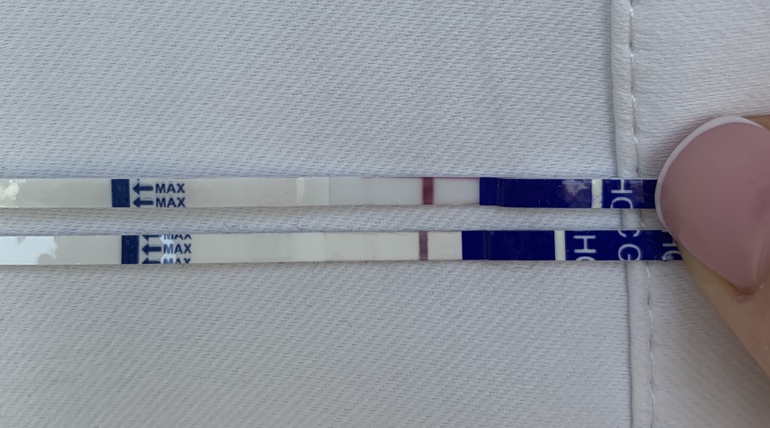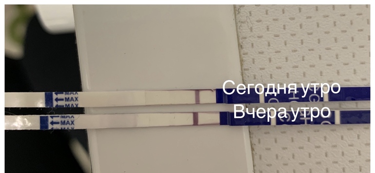 Это фото тестов вчера вечером 27 дц из 28-29 (нижний тест), сегодня утром 28 дц ( верхний тест) + тест фрау сегодня утро