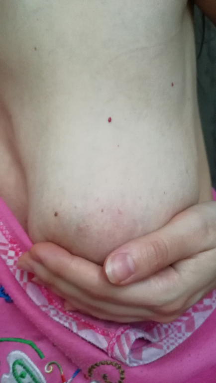 У неё на груди обеих и на шее короче полезли по всему телу. Только они у неё разных размеров но на груди самые большие.