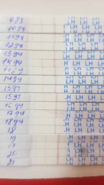 Овуляция( тесты на овуляцию)Девочки, помогите разобраться в этих тестах на О. Вообще в первый раз отслеживаю О, цикл не равномерный. Фирма тестов "Будьте уверены". На фото не особо видно, на 14 ДЦ вроде как полоски поярче, потом тусклые. И вот с 19 ДЦ одинаковые полоски (не сильно яркие, но отличаются.
