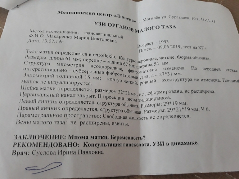 По узи не видно Б...если миома и была, то она там и сидит...Эндик хороший, но ЖТ в яичниках нет...Если хгч сдавали и оно "+", то ждите тогда и в динамики узи, как и написано.....пока все странно