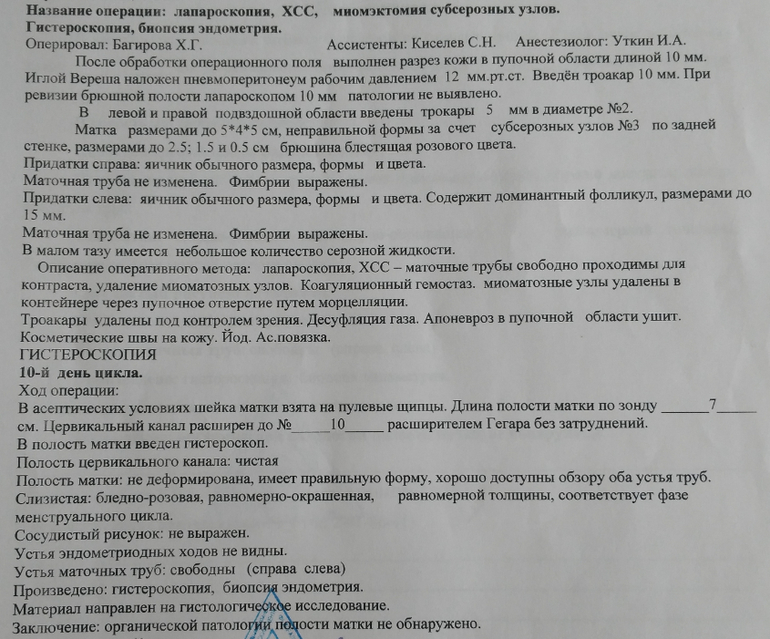 К июню месяцу подошла моя очередь на диагностическую лапару+гистеру по ОМС. Результаты лапары: бесплодие неясного генеза. Лечащий врач сказал, что трубы извилистые, тяжело будет самой беременеть - лучше сразу ЭКО, а вот хирург, который оперировала, сказала, что она лично глазьями видела, что с трубами все ок (в выписке ни слова про извилистость труб). Так же удалили субсерозные миомы на ножке. В асперате эндометрия после гистеры: либо полип эндометрия, либо хронический эндометрит.