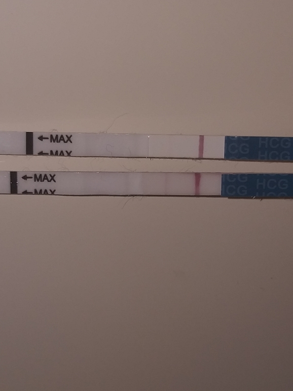 На обоих полоски есть! Просто верхний на более разбавленную мочу, там еще и "вчерашняя" моча!))) А нижний на свежую, когда уже хгч пошел!)))