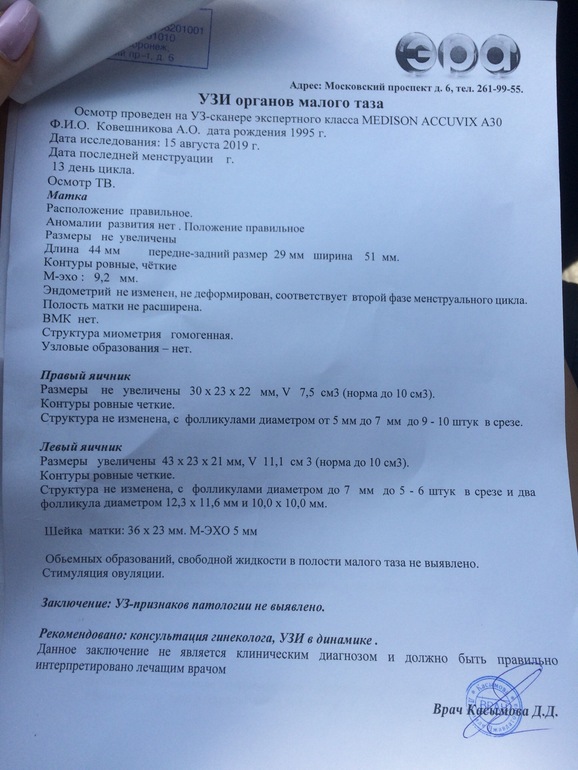 11ДЦ : УЗИ : Эндометрий 9 мм. В правом 5-7 мм 18 фолликулов, один 10мм. В левом 5-7 мм 10 фолликулов, 12мм, 10мм.