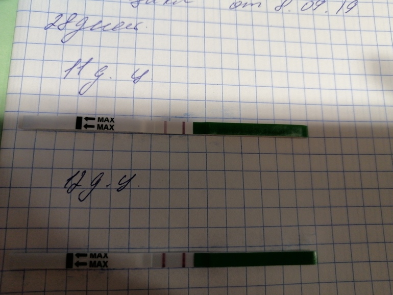 Сегодня 12д.ц. Сделала тест овуплан вчера и сегодня. На 11д.ц был сделан первый, вторая полоска была бледная, а сегодня достала, она оказалась вот такой как на фото . На 12 д. Ц, т. Е сегодня 2 яркие полоски.