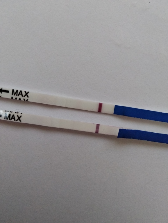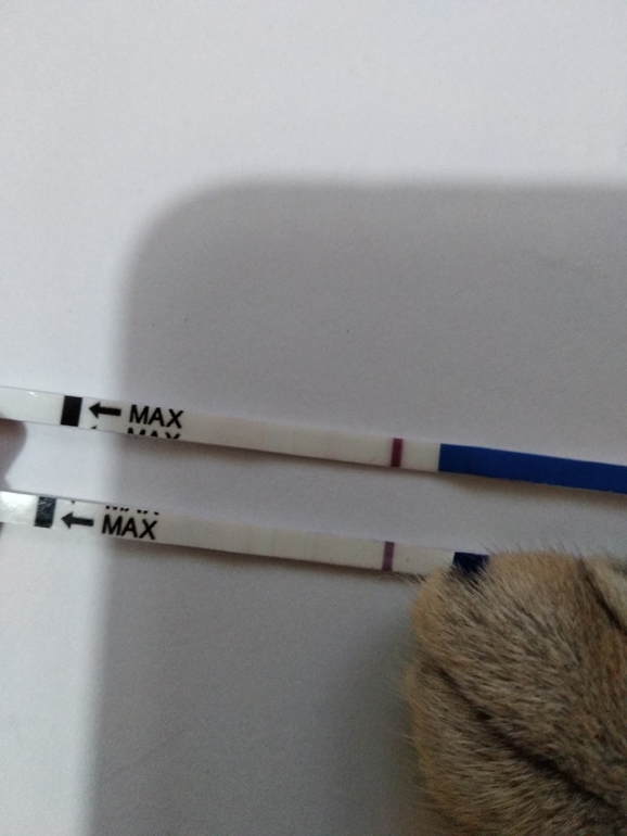 Верхний тест сейчас утром. Полоска появилась ещё когда до контрольной не дошло, и потом только ярчала. А нижний тест, это старый с реагентом.
