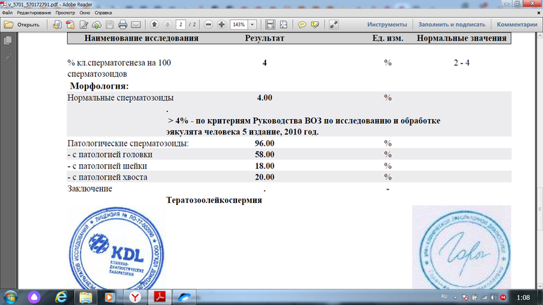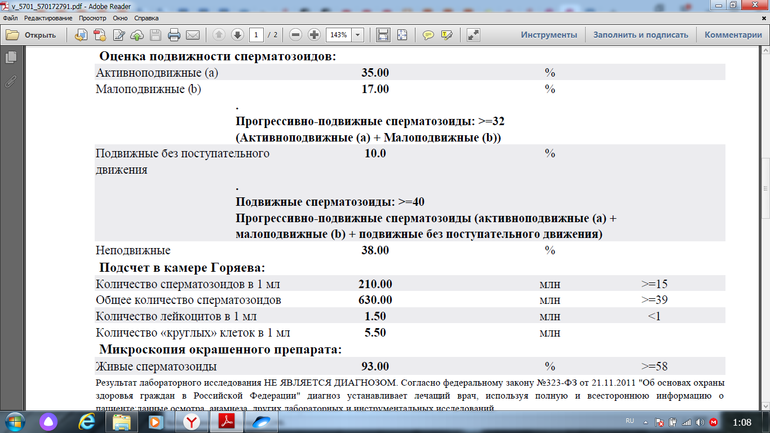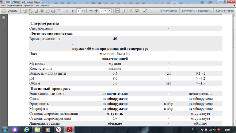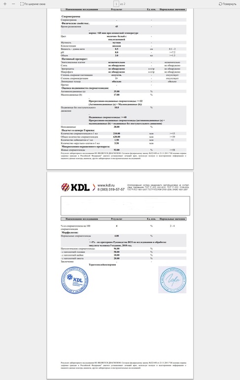 Из то что разглядела подвижность нормальная, морфология 4 процента не фонтан, но норма, вязкость тоже нормальная, остальное не понятно