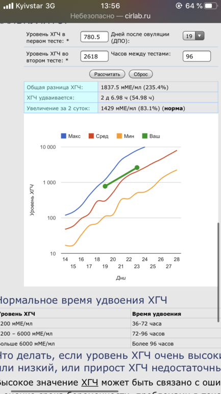 Скорость роста падает, если на 19 ДПО удвоение было каждые 44 часа, то сейчас уже каждые 55 часов.