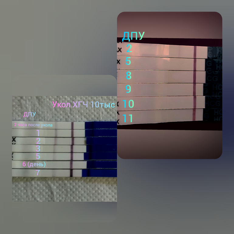 Вот мой выход укола на 6500. Верхние 4 теста это Эвик, 6,7 (утро, вечер), 8 дпо. Нижние это мама чек, те же дни. Сегодня 10 дпу