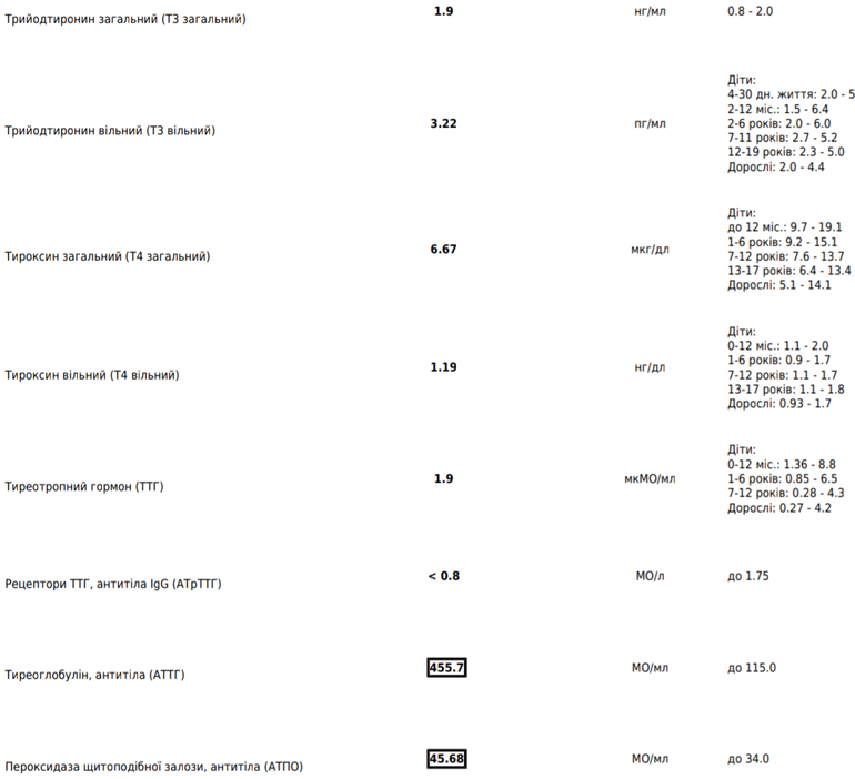 Свои показатели не помню, но у меня АИТ. С 17 лет. С 17 лет пью Л тироксин, только он нормализует показатели. Раз в год узи и анализ ТТГ и Т4. Щитовидка по узи увеличена. Избегаю солнце и резкие перепады температур.