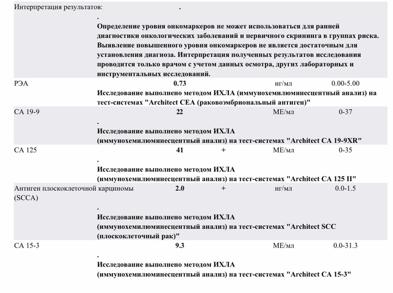 Ещё добавлю, что у моей мамы, уже при наличии диагноза рак кишечника, все онкомаркеры были в пределах нормы, хотя уже была 3-я стадия развития заболевания. Даже не у всех онкобольных они повышаются.
