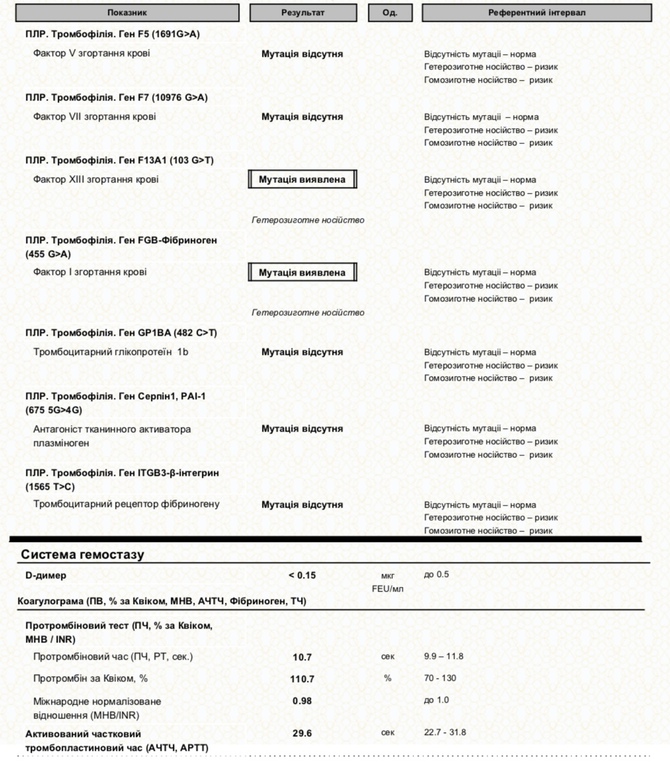 Это то, что есть у меня F13A1 (rs5985) - ген, кодирующий A-субъединицу XIII фактора свертывания (F13A1). При формировании фибринового тромба синтезируется фибрин-мономер, который затем полимеризуется. Фибрин - полимер при контакте с фибринстабилизирующим фактором F13 (ХIII фактор свертывания крови) в присутствии ионизированного кальция становится нерастворимым. Наличие в генотипе аллеля Т приводит к тому, что образующиеся фибриновые волокна более тонкие и легче удаляются в процессе фибринолиза. Наличие аллеля Т полиморфизма rs5985, особенно в гомозиготном варианте (при генотипе Т/Т) уменьшает риск развития спаечной болезни после оперативных вмешательств и снижает риск инфаркта миокарда и инсульта у пациентов с высоким уровнем фибриногена. FGB - фибриноген (rs1800790) - ген, кодирующий бета- субъединицу фибриногена. Фибриноген (I фактор свертывания крови) - белок, синтезирующийся в печени. В крови циркулирует в растворенном состоянии. При формировании тромба, в результате запуска реакций каскада свертывания крови, растворимый фибриноген переходит в нерастворимый фибрин. Наиболее распространен нейтральный вариант генотипа. Наличие аллеля риска А (варианты генотипа G/A, A/A) обычно приводит к повышенному уровню фибриногена в крови. Повышенные значения фибриногена ассоциированы с риском развития тромбоэмболических осложнений. ------- У меня F13 и PAI в гетерозиготе. F13 это типа тромбоз наоборот, и врач-гематолог мне сказала, что они якобы друг друга компенсируют, но я ей не верю, если честно. Потому что даже если в случае с гетерозиготой типа вероятность 50/50, что ген проявит себя, то где вероятность, что если проявит, то оба сразу. Может, проявит 13, а может ПАИ 🤔 Аналогично с твоим FGB. Остальные анализы вроде все нормальные, кроме фолатов понятно и амг.