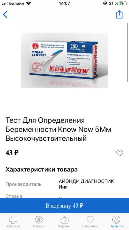 43 руб на аптека.ру, в пачке 5 шт. Один тест выходит меньше 9 руб.