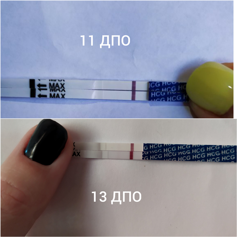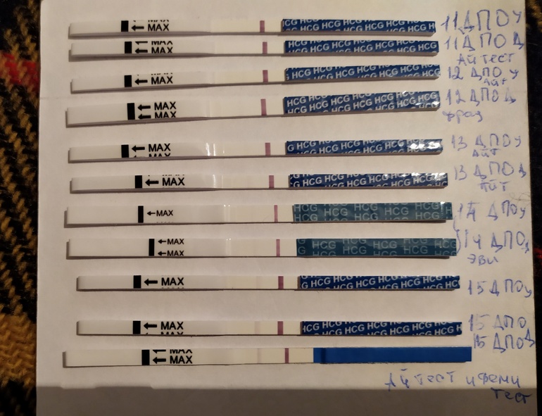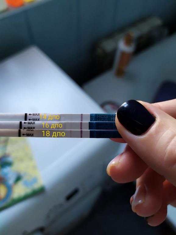 11 ДПО: утром первая еле-еле-еле-еле-еле только мне видная полосочка, которую плохо брал фотоаппарат. Когда все откомментили, что нет там ничего, написала грустный пост о том, почему нельзя раньше времени в сообщества выкладывать тесты и с психу замочила новый тест днём, а не вечером. И эта полосочка была настолько видна мне, что я даже мысли больше не допустила, что она может перестать ярчать))) Анрюшенька сказал, что он верит в малыша, а не в полоску, потому что "я мужик, а мужики не различают полутона", и до 13 ДПО я больше к нему не приставала😆