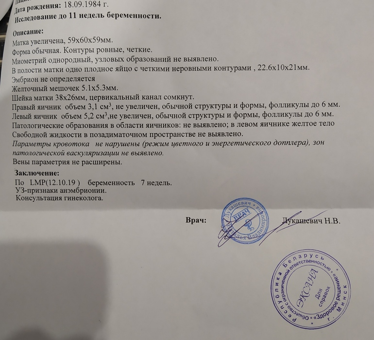 Замершая беременностьПо месячным ровно 7 недель,пя ещё выросло и жм вырос,стал больше нормы,что очень плохо и беременность изначально была с патологиями судя по нему((( Эмбрион тоже скорее всего замер на очень маленьком сроке( Чуда не произошло,буду готовиться к прерыванию((((