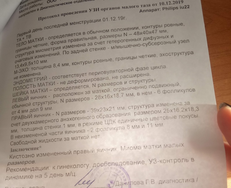 ФолликулометрияВсем привет. Может кто сталкивался... Решила начать обследование в связи с проблемами зачатия. Прогик и эстрадиол до этого сдавала, почти норма, но советовали поднять их обоих, возможно нехватка, эндометрий тонкий. Также сказали сдать амг. Его я сдала 1.85. на 10дц надо было пройти обследование УЗИ и тут началось... Во первых со второго дня цикла начала боль в пояснице, а в этот день вообще жесть, ели ходила. Во время УЗИ выяснилось, что у меня киста яичника 29мм примерно и миома на задней стенке 13*9мм. Что это может быть? Может с гормонами переборщила??? И как это лечится? Жутко расстроилась (((( прикладываю фотки УЗИ