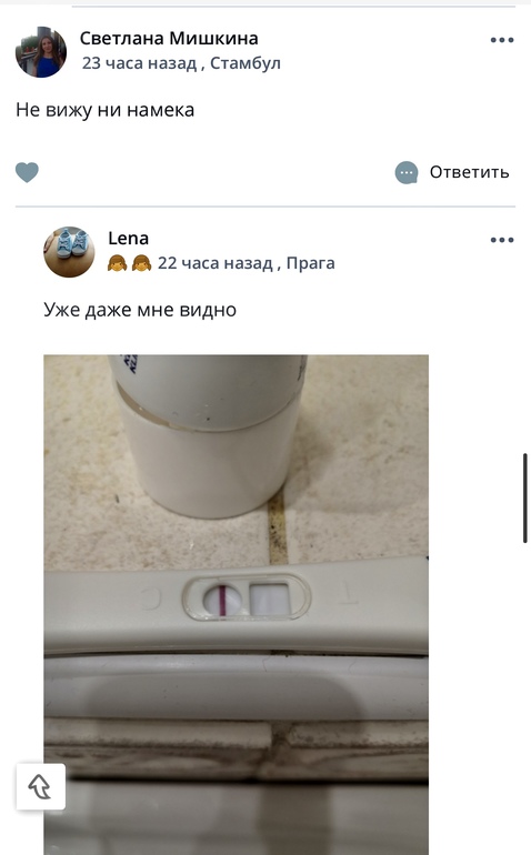 Да я и не огрызаюсь,мне то что...)меня на самом деле очень смешит эта девушка)))правда😊и мне кажется,грубо я ничего не написала)тут не только я уже заметила за ней,что она абсолютно всем пишет на явные🤰🏻 полоски-отрицательно.Да и я не в коем случае не склоняю никого ложно писал комментарий.Я сама если вижу-пишу,если её нет,то тут уж ничего не поделать.Меня удивляет ,как так уверенно человек ,в утвердительной форме оставляет свои комментарии.Обратите внимания сами,только вчера она на три поста с беременной полоской как приговор пишет- «нет беременности»