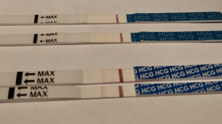 На фото: самый верхний тест - вчерашний эвик, потом эвик из той же пачки на утреннюю мочу сегодня, а два нижних сделала сегодня в обед, это хоум и экспресс (оба с чувствительностью 10).