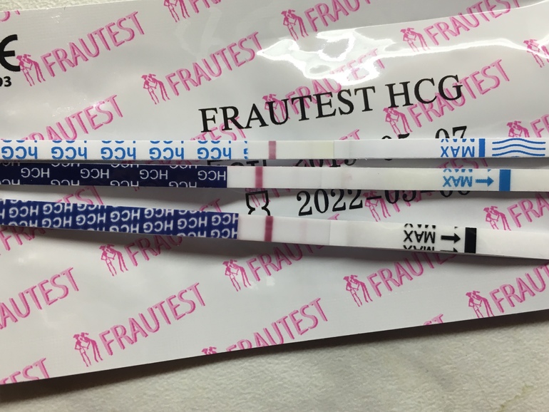 Ждем дня Х (Признаки беременности / Тесты)В первый месяц поздно начали я думаю, уже овуляция предпологаемая прошла, и не получилось, вот второй раз пробуем два дня до задержки осталось, вчера сделала тест клиаблу плюс , сегодня утром сделала обычный тест самый верхний и вечером сделала фрау тест и второй самый нижний ева, сразу два тк фрау все же показывает слабо видную полоску , не знаю уже можно начать радоваться?)