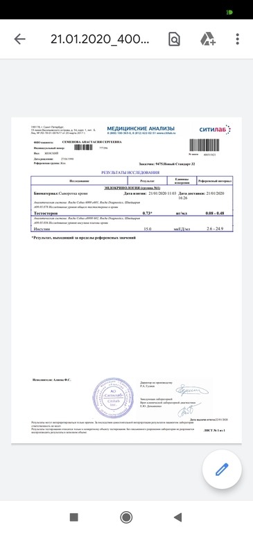 АнализыДевочки кто сталкивался, повышен тестостерон 0 . 73 планируем в этом цикле стимуляцию. Кто делало стимуляцию с повышенным тестостероном не помешал ли он как нибудь? Или кто как снижался его. Проблем со щитовидкой нет и другие гармоны в норме. Эндокринолог ничего толкового не говорит.