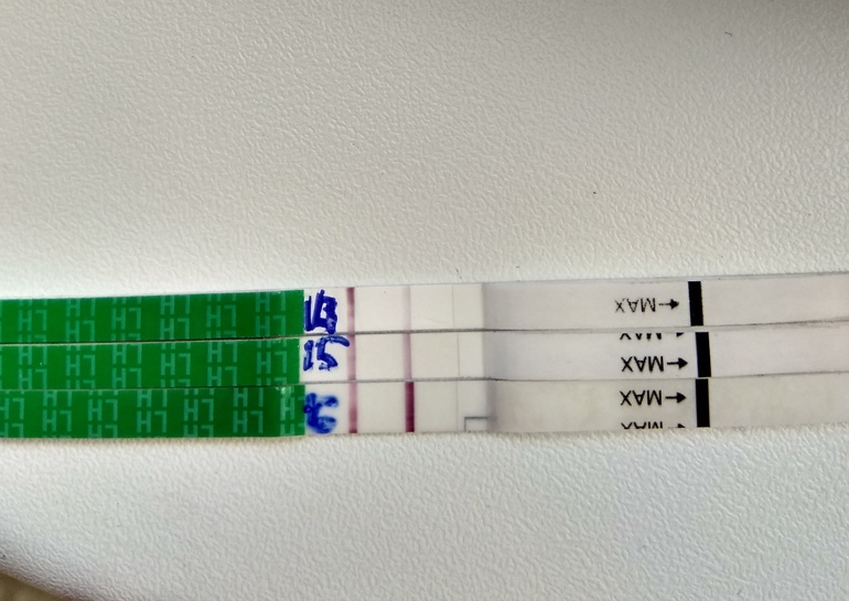У меня последний цикл были такие вот полоски, то есть сначала ярчали, потом бледнели, но такой же как контрольная или ярче - не было. Я решила, что пролёт 🤷♀️ Тест на б уже в день х сделала, ибо м не спешили приходить и он // показал🤷♀️ Только я овуляцию даже не чувствовала😳