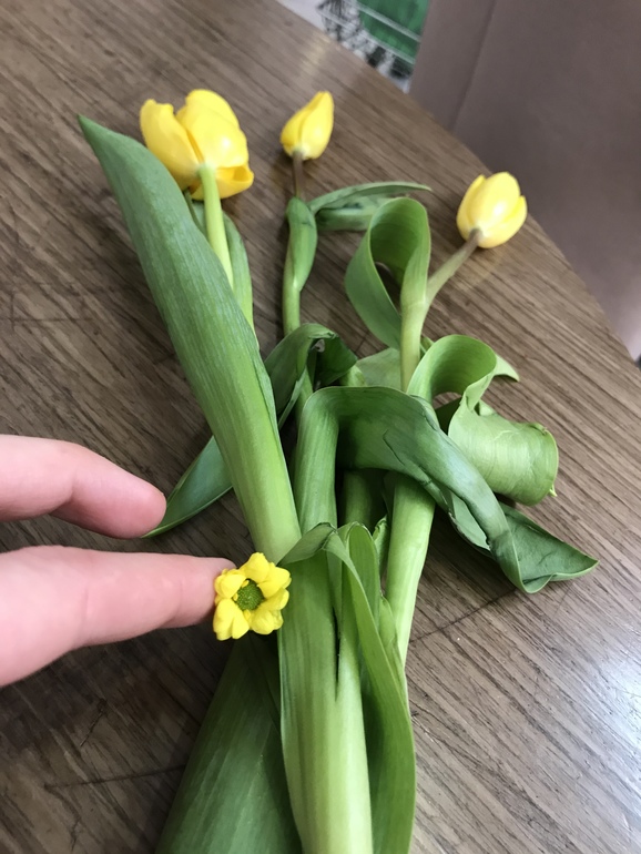Перед 8 марта съездили с подругой к Матронушке. Я положила 3 белых розы, а на выходе мне дали 3 желтых тюльпана (мои любимые), а когда из церкви выходила заметила, что в стебле спрятался малыш 😊😊😊