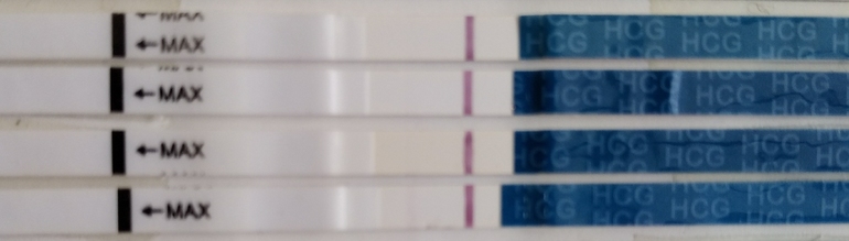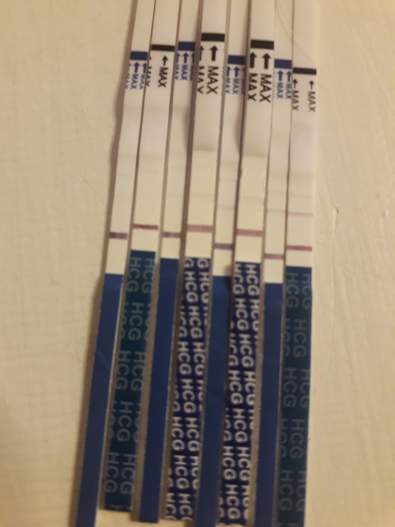 Фото вам без обработки, чтобы понимали что полоски очень слабые. Первые два теста это 9дпо утро и вечер, 3,4 тест это 10дпо утро и вечер. Я ходила сдавать ХГЧ на 10дпо утром ( получается 3 тест) и было 19.
