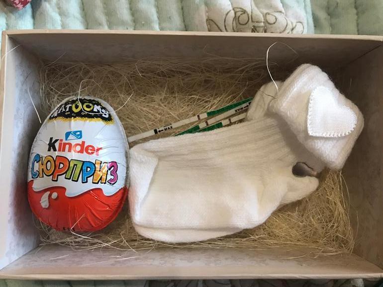 Я так хотела преподнести коробку с соской, цифровым тестом, пинетками... А увидела // тут же побежала к мужу, разревелась, короче, сюрприз не удался) Так и лежит цифровой, сделаю на днях для памяти.